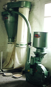 Das Getreide wird aus dem oberen Trichter selber angesaugt und gelangt in die Mitte der Kammer. Durch die Fliehkraft werden die Körner nach außen in die Umlaufbahn der Hämmer getrieben. Die zerschlagenen Körnerteilchen können die Kammer nur durch ein Sieb verlassen, welches über zwei Drittel des Umfangs der Kammer angebracht ist. Dieses Sieb ist austauschbar. Je nach Lochgröße im Sieb wird ein feineres oder gröberes Schrot erzeugt. Haben die Körner die Kammer verlassen, werden sie durch einen Luftstrom in den Zyklon befördert. Hier werden die feinen Staubanteile ausgefiltert, die Luft über einen Schlauchfilter ausgeblasen. Im Trichter des Zyklon sammelt sich das Schrot und kann abgesackt werden. Die Mühle hat eine automatische Steuerung, welche die Mühle abschaltet, wenn kein Getreide mehr angesaugt wird. Die Mühle ist voll funktionsfähig und wird regelmäßig vorgeführt.