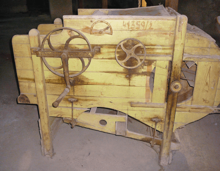 Die älteste Maschine musste noch von Hand bedient werden. Hierzu ist von außen ein Handrad an einer Riemenscheibe angebracht, die mit einem Flachriemen alle Funktionen der Wannmühle antreibt.