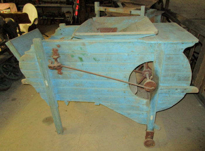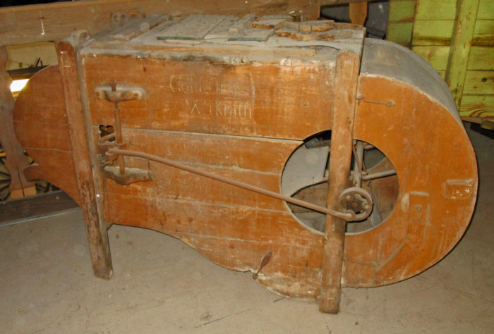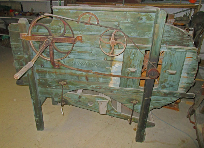 Das neuere Modell, von ca. 1940, besitzt eine Keilriemenscheibe, wurde also schon mit einem Motor betrieben. Die Übertragung des Antriebs erfolgt hier mit einem Gestänge.